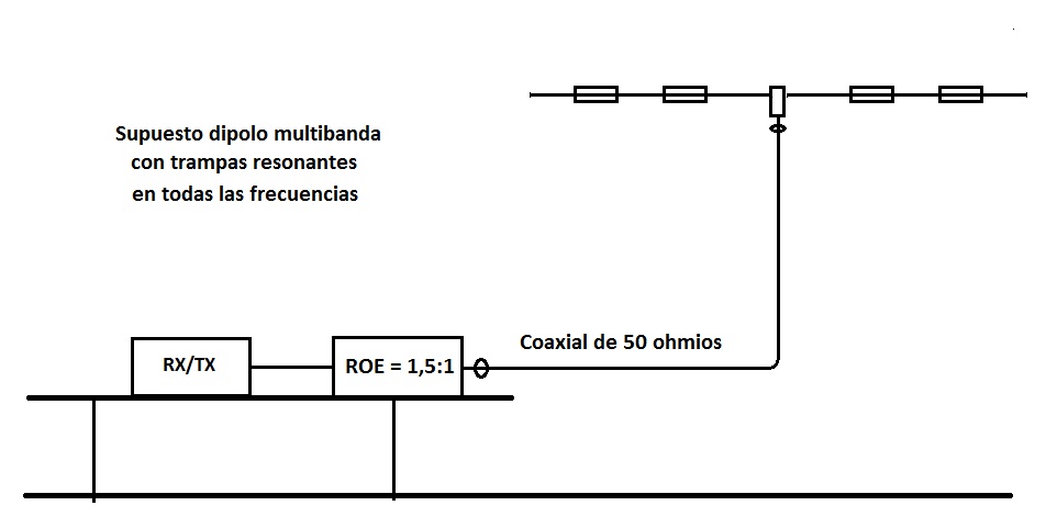 Así que aquí supondremos que tenemos un dipolo horizontal resonante en todas las bandas con una impedancia en el centro de 72 ohmios, la impedancia que presenta un dipolo en el espacio libre y que más o menos se consigue colocándolo a una altura de media longitud de onda. Eso hace que supongamos presente una ROE de 1,5 en todas las bandas, aunque lógicamente no estaría a una altura de media longitud de onda en todas ellas.