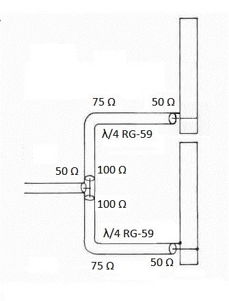 Se utilizan secciones de RG-59 de λ/4 (por el factor de velocidad) para elevar la impedancia desde 50 O a 100 O y permitir la conexión en paralelo de estos tramos para recuperar los 50 ohmios que se adapten a la bajada. La polarización circular se conseguiría mediante una sección de λ/4 de RG-58 para conseguir el desfase de 90º correspondiente a la polarización circular. Por supuesto todos los λ/4 deberían ser acortados por el factor de velocidad correspondiente a cada cable utilizado.