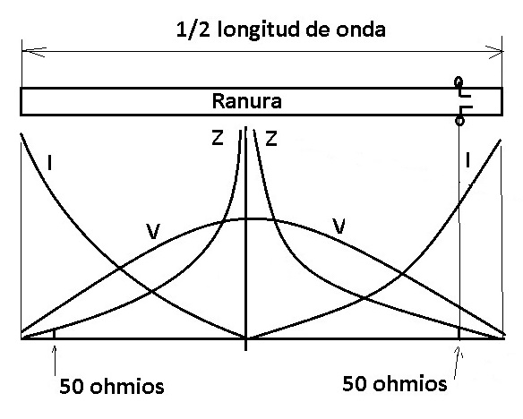 Veamos la figura 2: donde el dipolo tiene las máximas tensiones (en las puntas), la ranura resonante tiene las corrientes máximas en el metal situado en ambos extremos. Y donde el dipolo tiene la corriente máxima (en el centro), la ranura tiene la máxima tensión de RF, a los dos lados opuestos de la ranura. De esta guisa, la impedancia resistiva en la resonancia en media onda es máxima en el centro (recordemos la ley de Ohm (R = V/I) porque la corriente en los dos lados del centro de la ranura se acerca a cero.