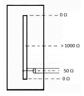 Por tanto, la adaptación perfecta a un cable de 50 ohmios, en lugar de estar en el centro como en un dipolo, se encuentra muy cerca de los extremos de la ranura, aproximadamente a un 4-5-6 % del extremo de la ranura. Ahí debemos colocar el vivo y la malla de nuestro cable coaxial, tal como se ve en la figura 3.