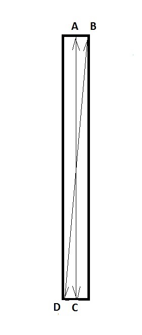 El ancho de banda puede ser tan grande como queramos, pues dependerá de si aumentamos el ancho de la ranura, igual que el mayor ancho del cable o del tubo de aluminio aumenta el ancho de banda de un dipolo. La frecuencia máxima de resonancia nos viene dada por la longitud más corta AC, la dimensión lateral de la ranura, mientras que la frecuencia más baja nos viene dada por la longitud más larga BD, la diagonal, tal como se ve en la figura 4.