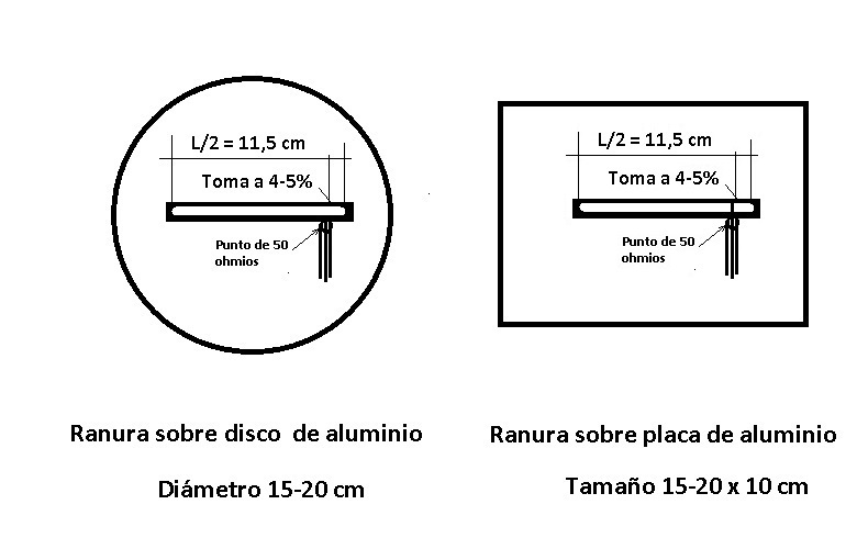 Por eso se me ocurrió que la antena que sería más fácil de realizar y colocar en el fondo de un soporte aislante, como una cestilla o una caja de porexpan, que será el recipiente más probable para que el globo transporte la electrónica a las alturas, podría ser una placa rectangular o un disco metálico, realizado ya sea en aluminio o en una placa de circuito impreso con la cara de cobre lista para insolar y que tenga unas dimensiones que permitan trazar una ranura de 11,5 centímetros, media longitud de onda para la banda de 23 cm o 1296 MHz, según se muestra en la figura 7.