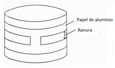 La cuestión es que el perímetro del cilindro, multiplicando el diámetro por p, era de unos 103 cm, perfecto para recubrirlo con papel de aluminio de envolver bocatas y cortarle una ranura de 1 metro. Preparé un conector hembra de PL (SO239) con 2 hilitos que, una vez pelados, sujeté con cinta aislante cerca de uno de los extremos de la ranura y ya tuve una antena de sobremesa de ranura, que se me ocurrió llamarla antena de tambor, porque también se puede utilizar para estos menesteres percusionistas. El resultado lo tenéis en la figura 9. Por cierto que radia omnidireccional y con polarización vertical, aunque no lo parezca.