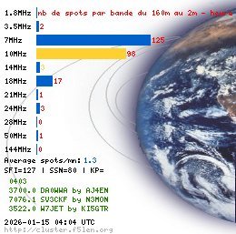 LU9DA (Ricardo "Rick" Suárez) ha desarrollado un script en Perl que muestra de manera gráfica y en tiempo real las condiciones de propagación existentes en las diferentes bandas de radio. A través de los mapas que se generan a partir de la información captada por el dxclúster LU9DA-6, se puede apreciar cómo se encuentran las bandas de radioaficionado, cuáles son las más activas y en cuáles se están dando los contactos a más larga distancia (qué bandas cuentan con mejores condiciones de propagación).